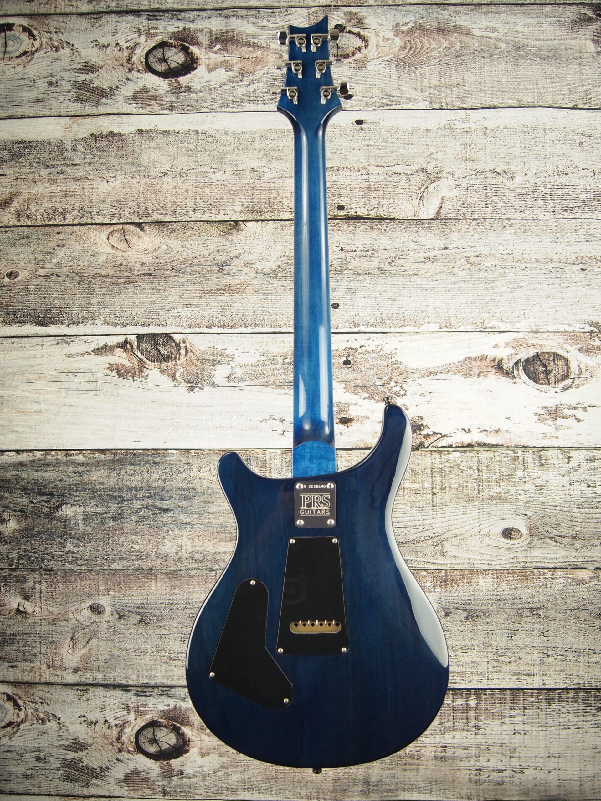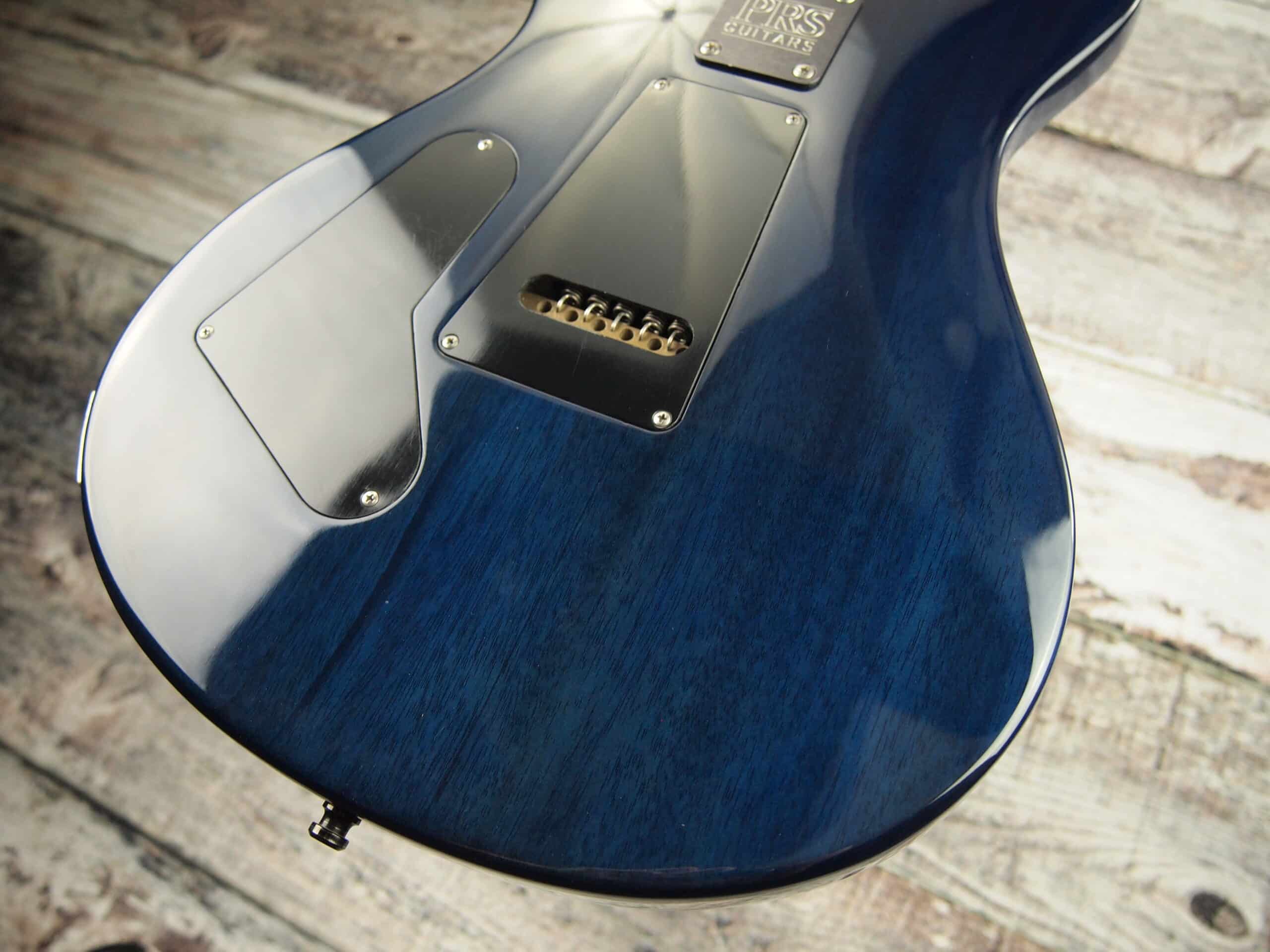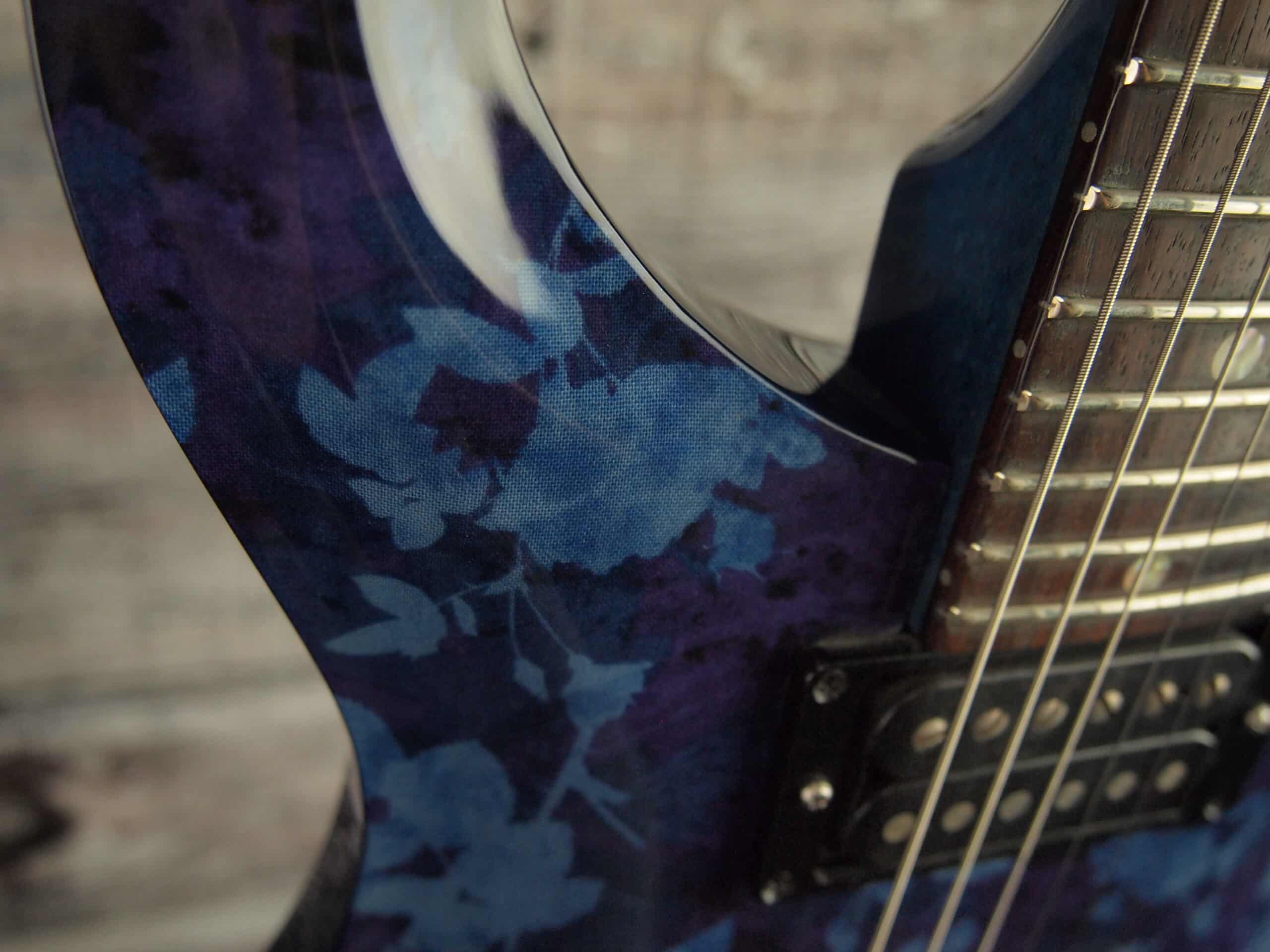 This came to us a stock Paul Reed Smith. The finish was pretty rough, so we decided that it needed a makeover. We have had success with our custom made T-casters covered in fabric and felt this one was a candidate for this cool fabric top. The back has been painted in trans blue. It also comes with the hard shell case.