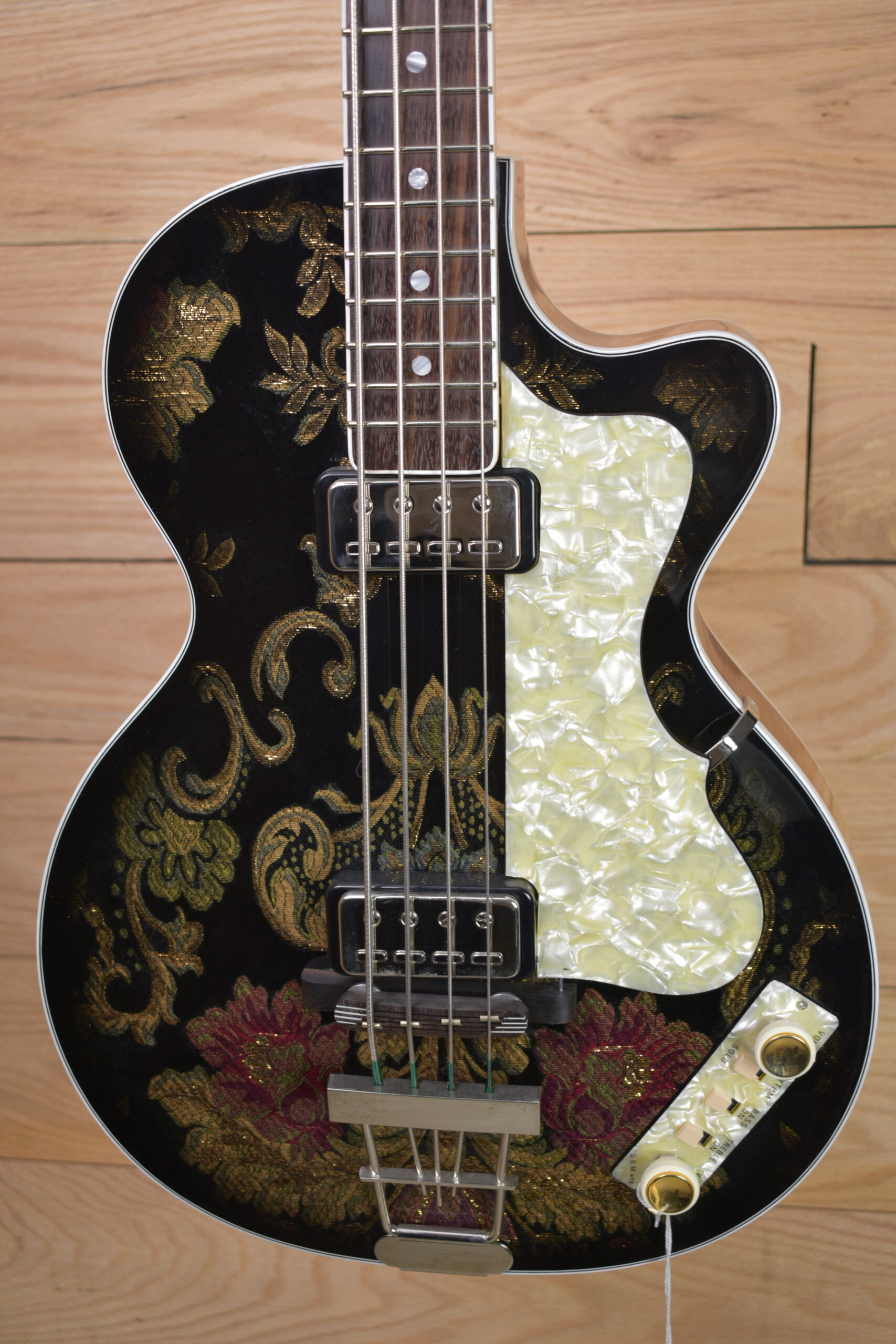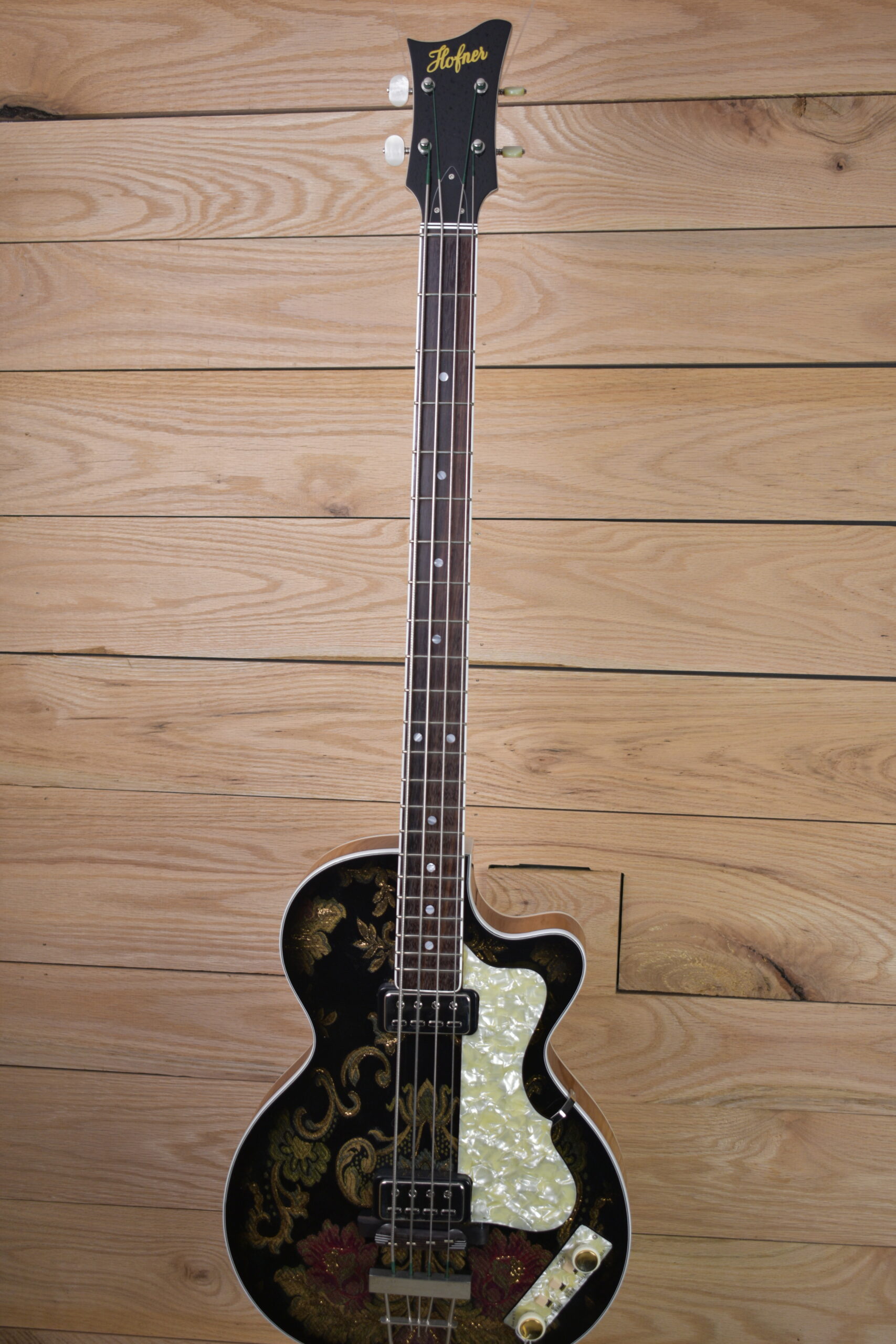The Hofner Club Bass LTD in Black & Gold Victorian Embroidery is nothing short of a masterpiece, blending the finest craftsmanship with an aesthetic that is pure luxury. From the moment you set eyes on it, the intricate Victorian-style embroidery detailing captures your attention, exuding a regal charm. The black and gold color scheme is not only striking but elevates the bass into a true work of art—an instrument that demands attention both sonically and visually.