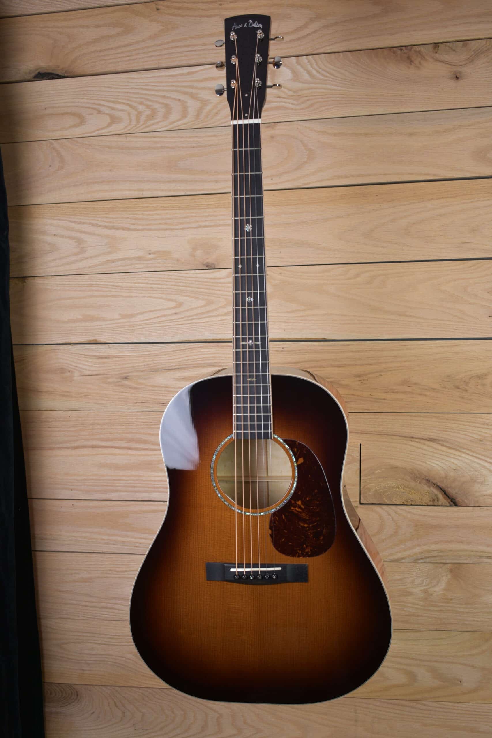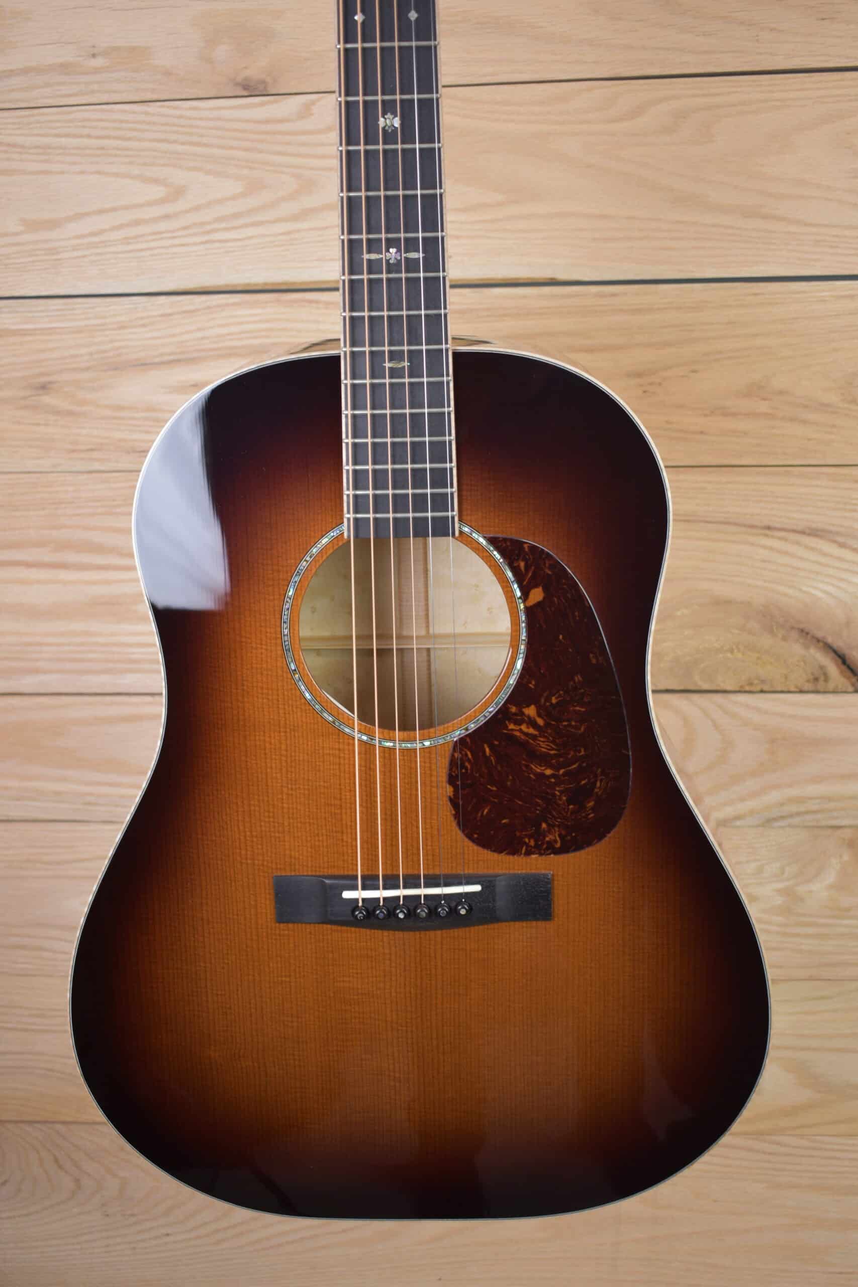 This slope-shouldered guitar is designed for brawny power. Big in sound but not short on clarity, this guitar is a nod to the traditional slope-shoulder guitars of the 1930s and ’40s. Its standard woods are Sitka spruce paired with either Indian rosewood or mahogany. In concept, we think of the rosewood version as a slope-shouldered D-RH and the mahogany version as a slope-shouldered DM. The pairs sound similar, and all four sound their best with medium strings and hard playing. The DS comes standard with a beautiful vintage sunburst, maple bindings, and 42-style snowflake fretboard inlays.